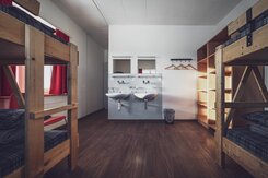 Multi-bed rooms with bunk beds, clothes racks and lavabo | © Davos Klosters Mountains